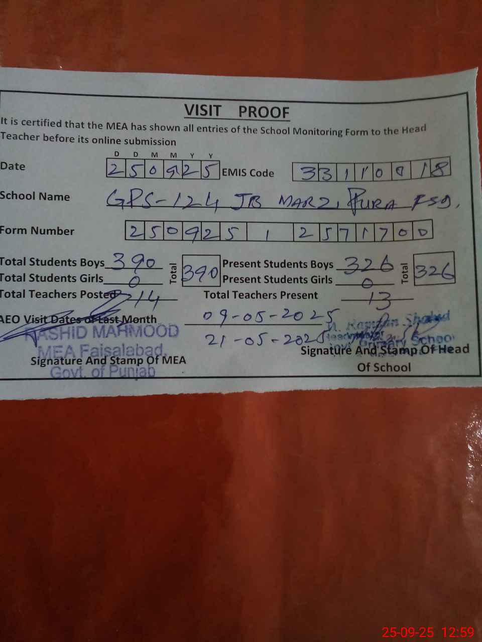 | Attendance Register | Head Teacher | MEA with School | Visit Proof |