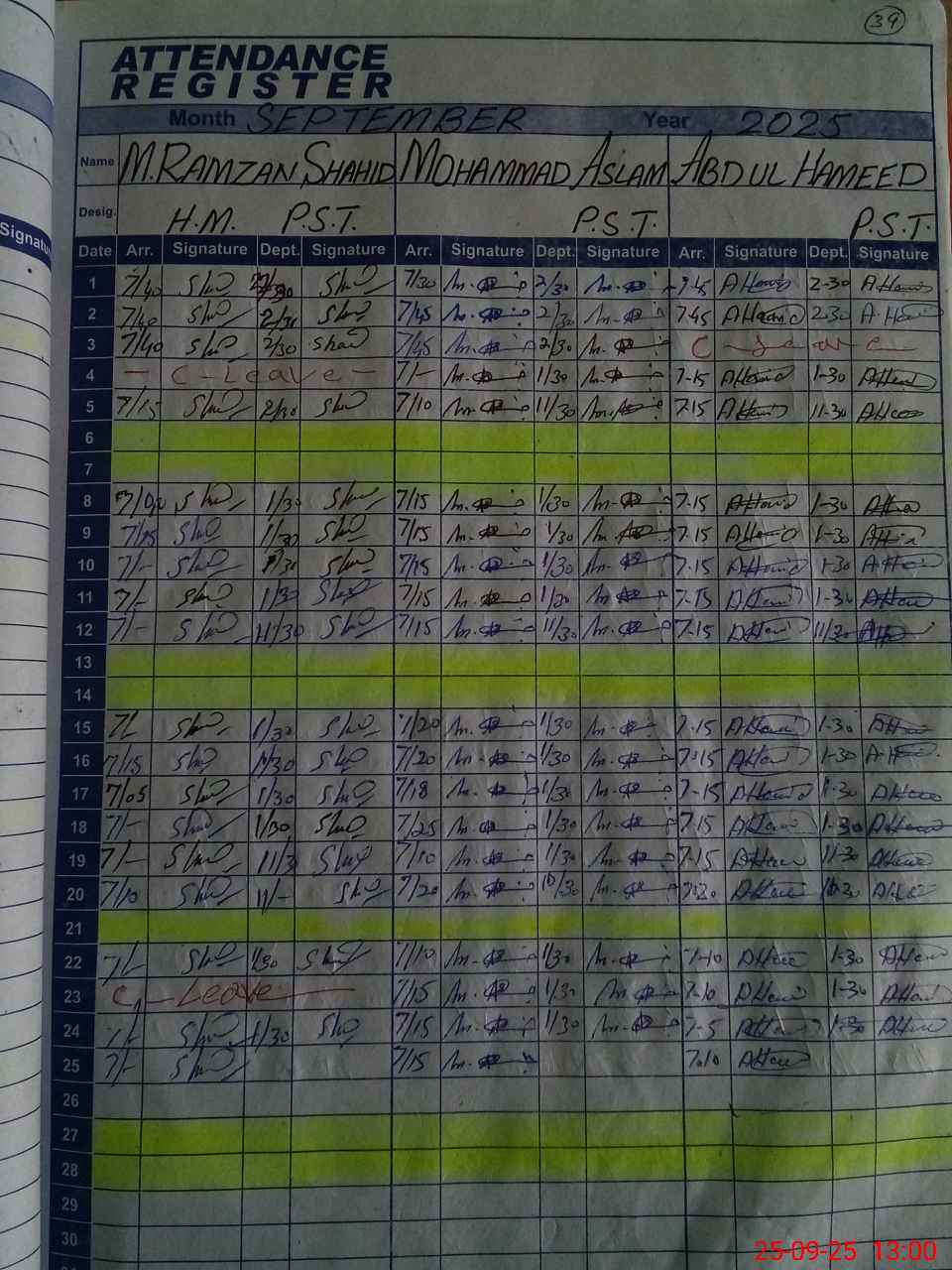 | CNIC | Full Name | Designation | R/C | Absence during last cal. month |