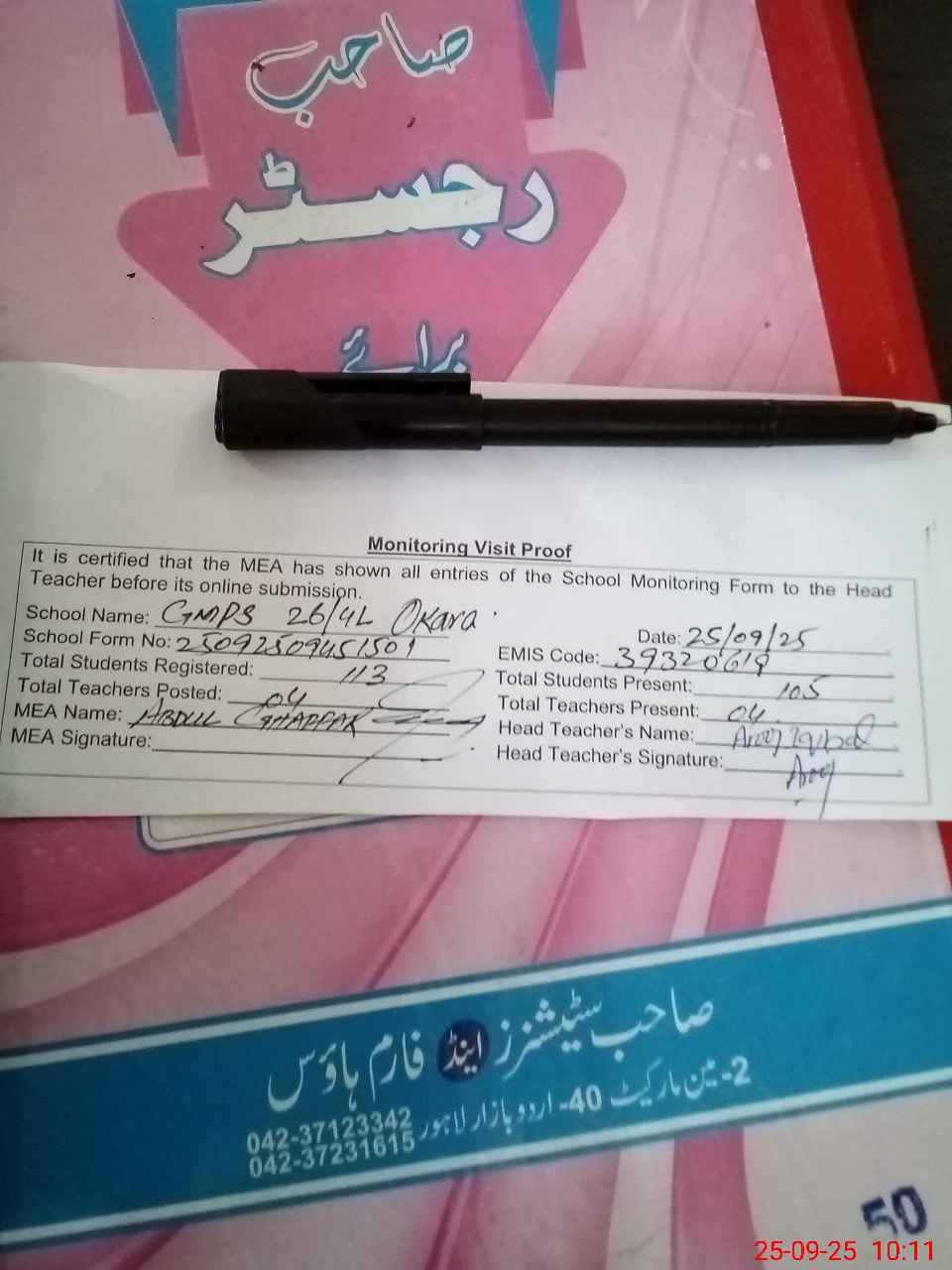 | EMIS Code: 39320619 | Name of School: GMPS CHAK NO. 26/4-L | |||