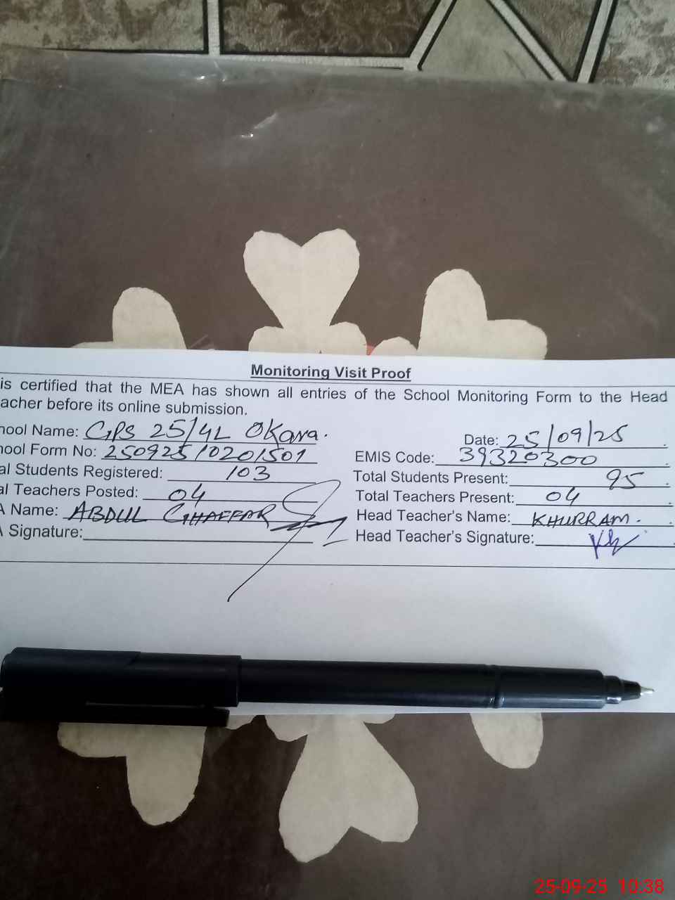| Attendance Register | Head Teacher | MEA with School | Visit Proof |