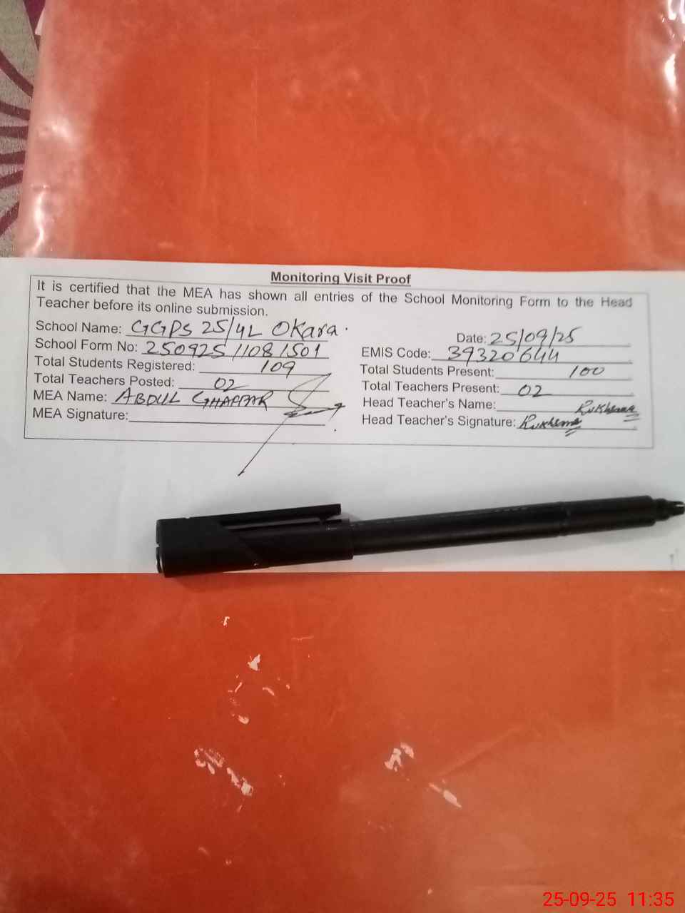 | Attendance Register | Head Teacher | MEA with School | Visit Proof |
