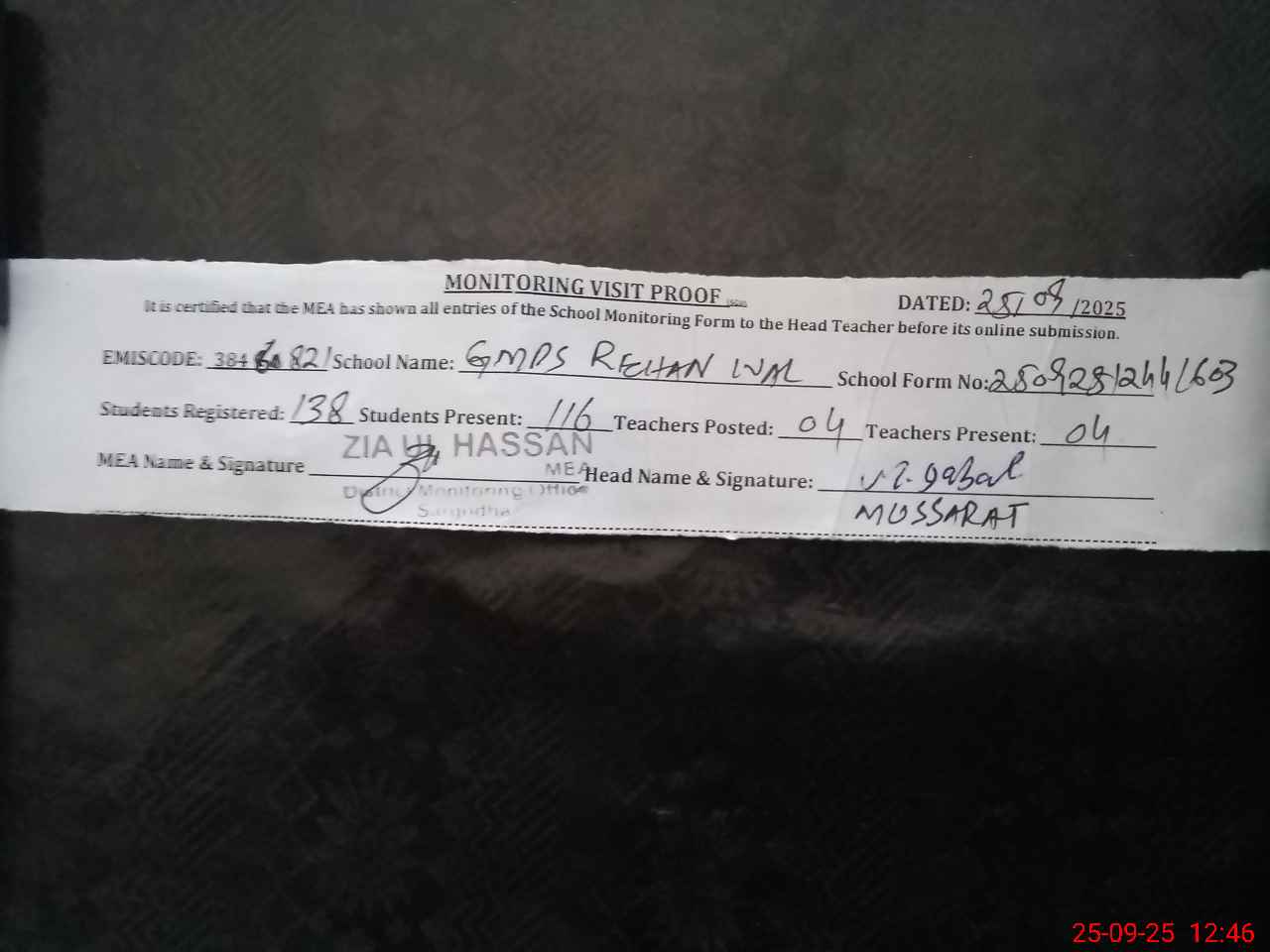 | Monitoring Date: 25-09-2025 | Start Time: 25-09-2025 12:25 PM | End Time: 25-09-2025 12:52 PM | Name of MEA: ZI**** ULHA**** | |