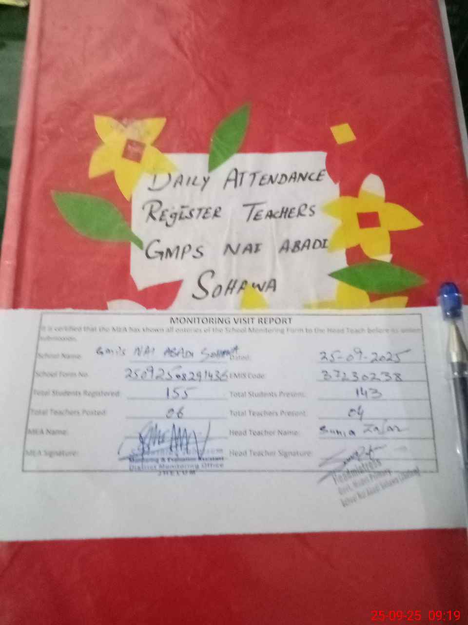 | Attendance Register | Head Teacher | MEA with School | Visit Proof |