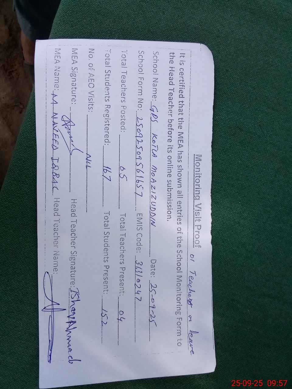| Attendance Register | Head Teacher | MEA with School | Visit Proof |