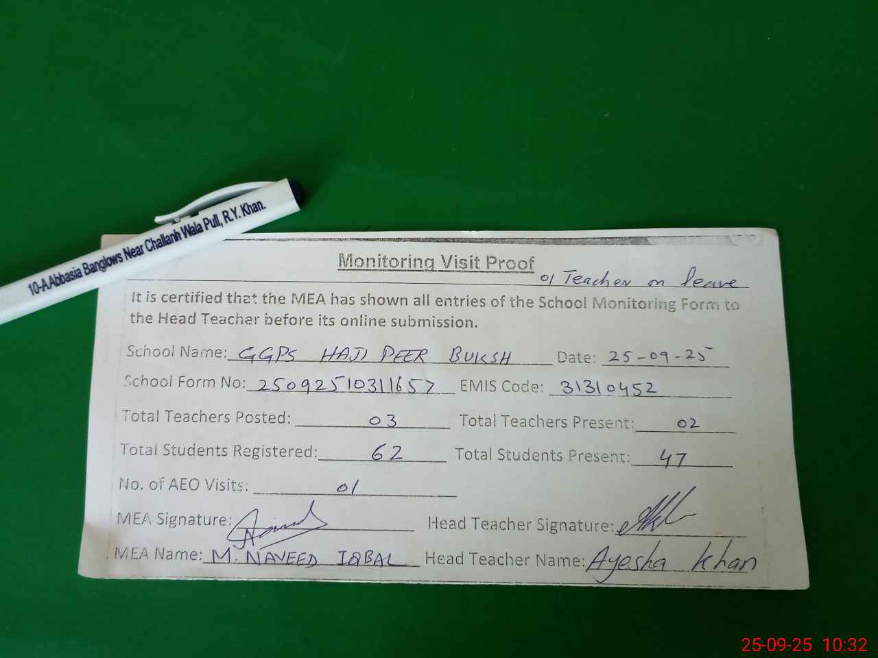 | Attendance Register | Head Teacher | MEA with School | Visit Proof |