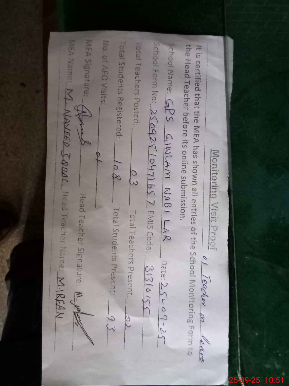 | EMIS Code: 31310155 | Name of School: GPS GHULAM NABI LAR | |||