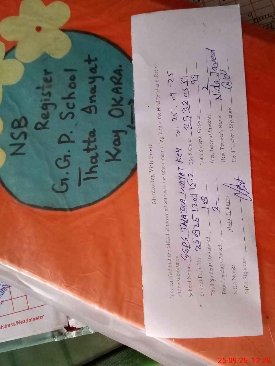 | Attendance Register | Head Teacher | MEA with School | Visit Proof |