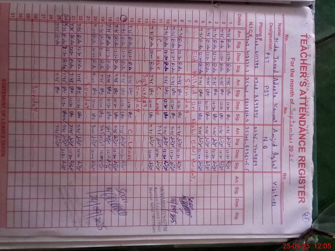 | CNIC | Full Name | Designation | R/C | Absence During Last Calender Month |