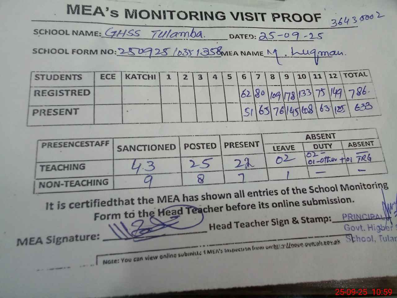 | Certified that this School was Inspected by the Undersigned MEA/DMO Today and the Information Stated Above is as Per Record. | |||||
