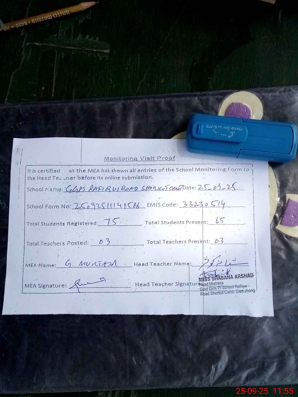 | Attendance Register | Head Teacher | MEA with School | Visit Proof |