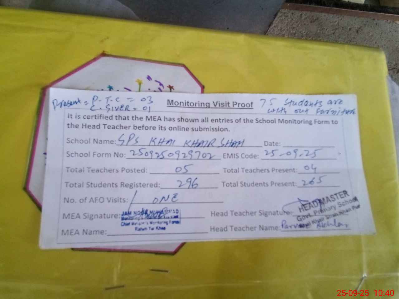 | Attendance Register | Head Teacher | MEA with School | Visit Proof |