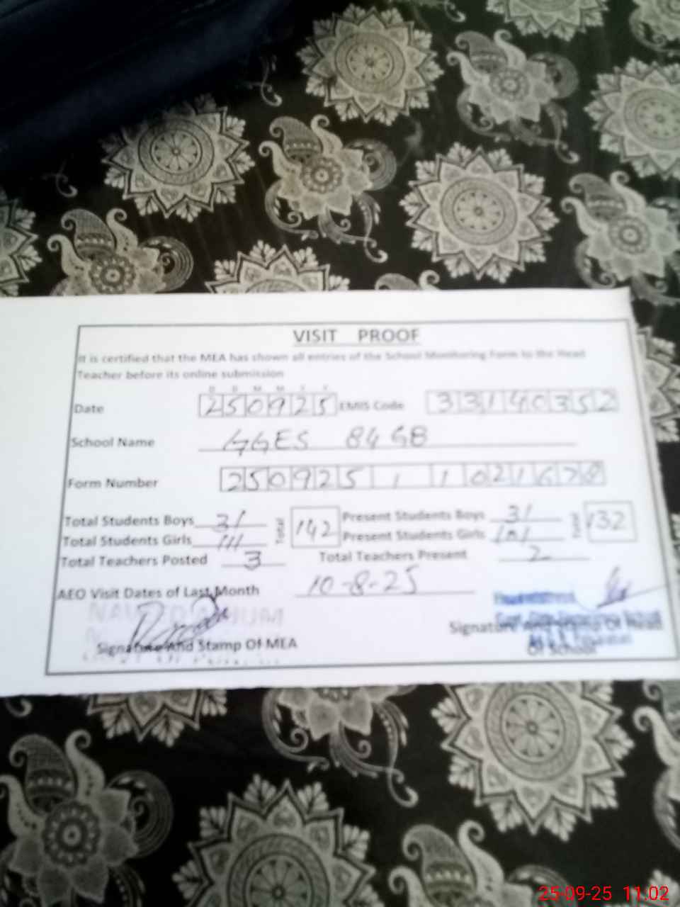 | Attendance Register | Head Teacher | MEA with School | Visit Proof |