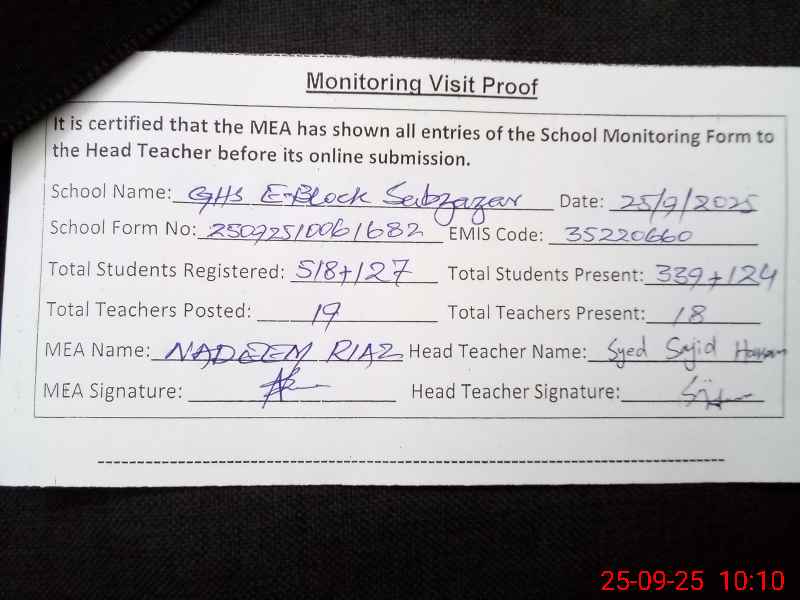 | EMIS Code: 35220660 | Name of School: GHS E-BLOCK SABZAZAR LAHORE | |||