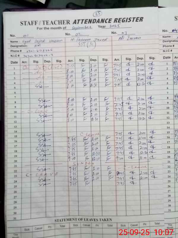 | CNIC | Full Name | Designation | R/C | Absence During Last Calender Month |
