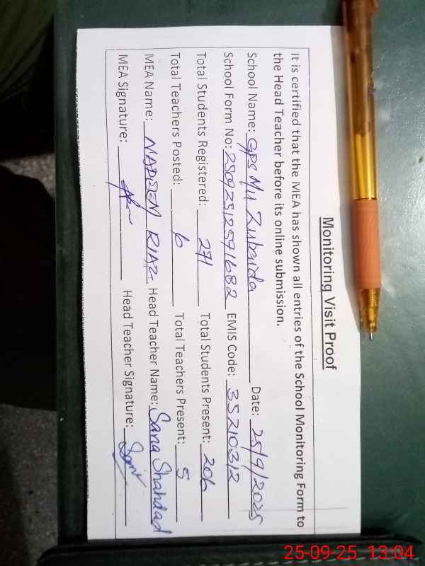 | EMIS Code: 35210312 | Name of School: GPS MU ZUBAIDA MULTAN ROAD BAIT UR RAZA COLONY | |||