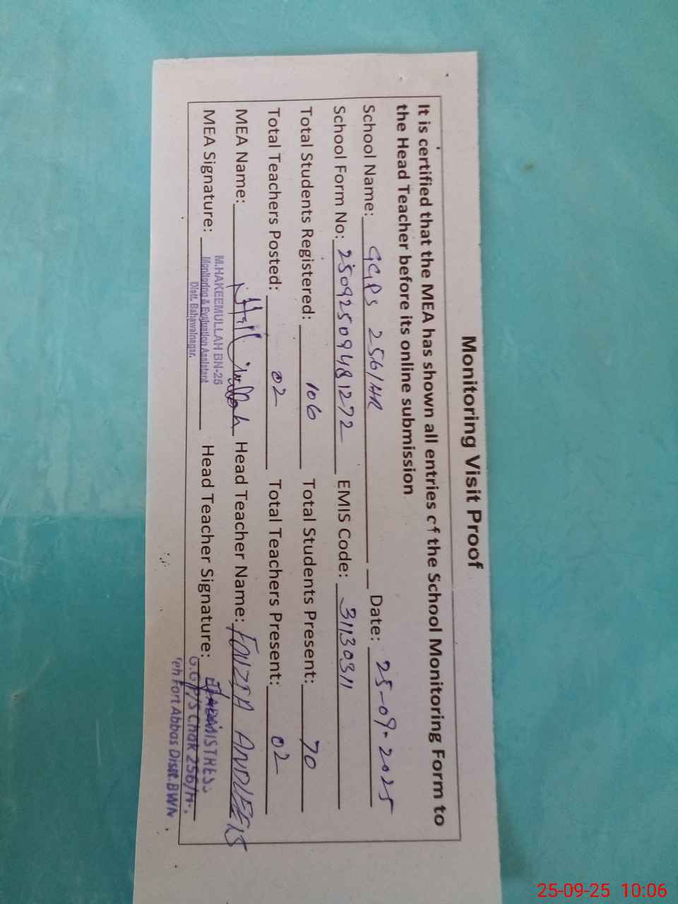 | Attendance Register | Head Teacher | MEA with School | Visit Proof |