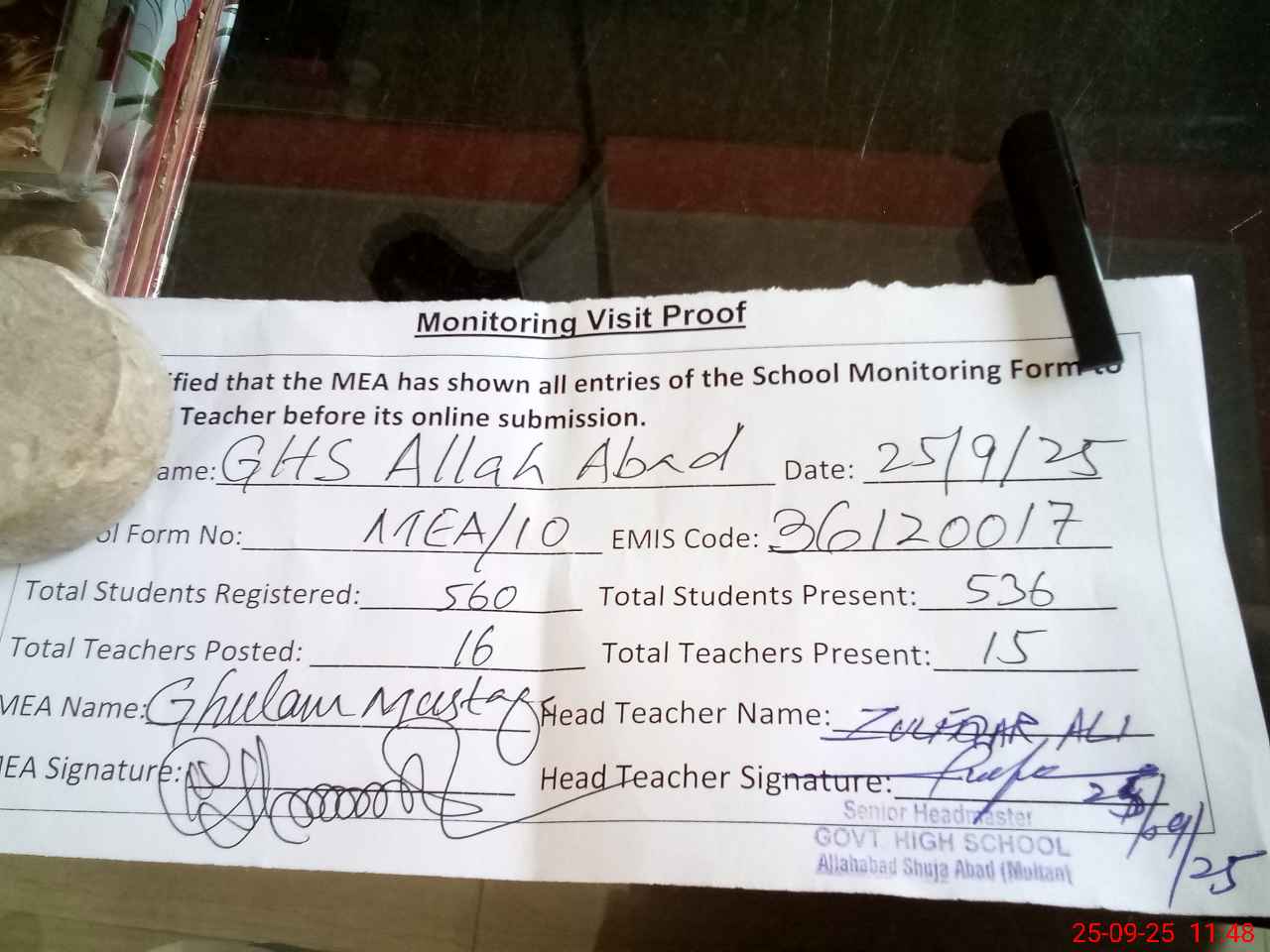 | EMIS Code: 36120017 | Name of School: GHS ALLAH ABAD SHUJABAD | |||