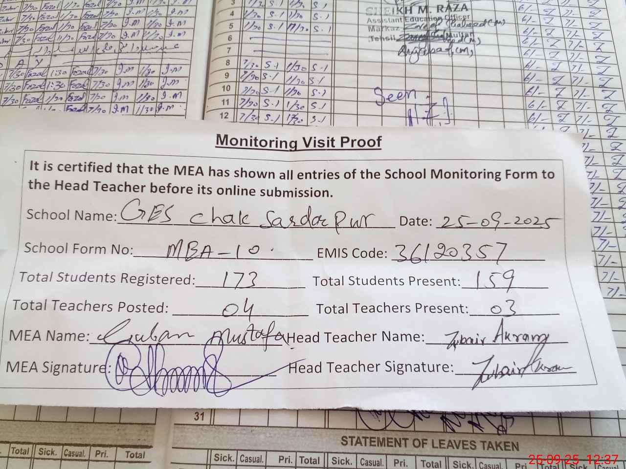 | Attendance Register | Head Teacher | MEA with School | Visit Proof |