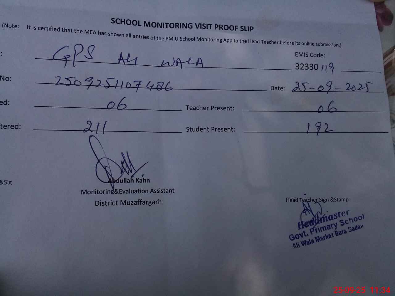 | Attendance Register | Head Teacher | MEA with School | Visit Proof |