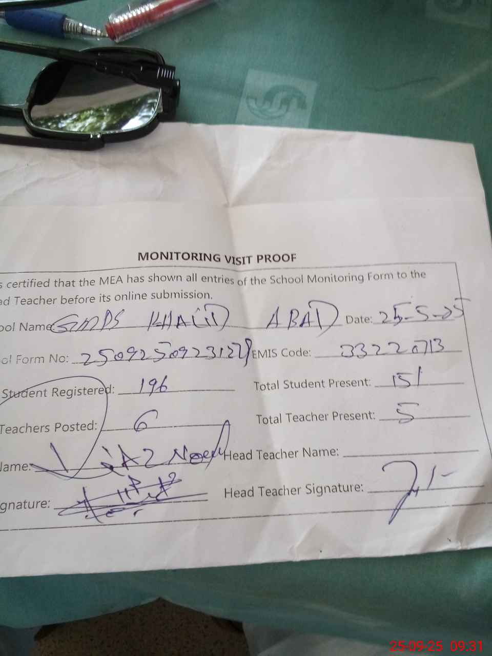 | Attendance Register | Head Teacher | MEA with School | Visit Proof |