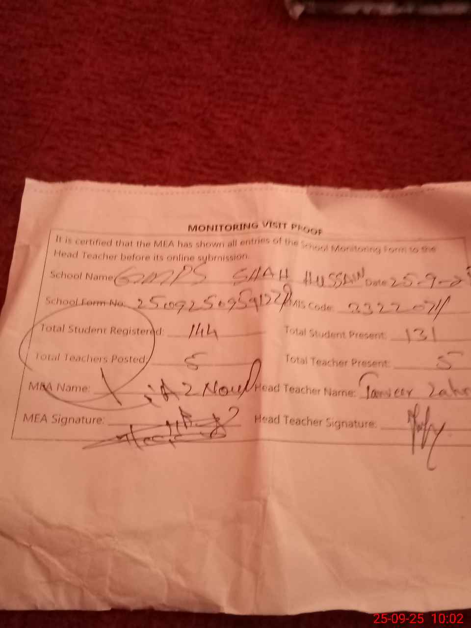 | Attendance Register | Head Teacher | MEA with School | Visit Proof |