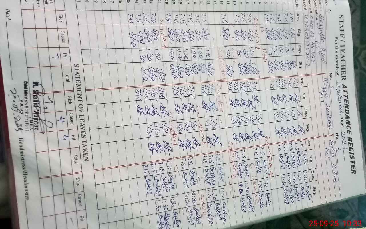 | Attendance Register | Head Teacher | MEA with School | Visit Proof |