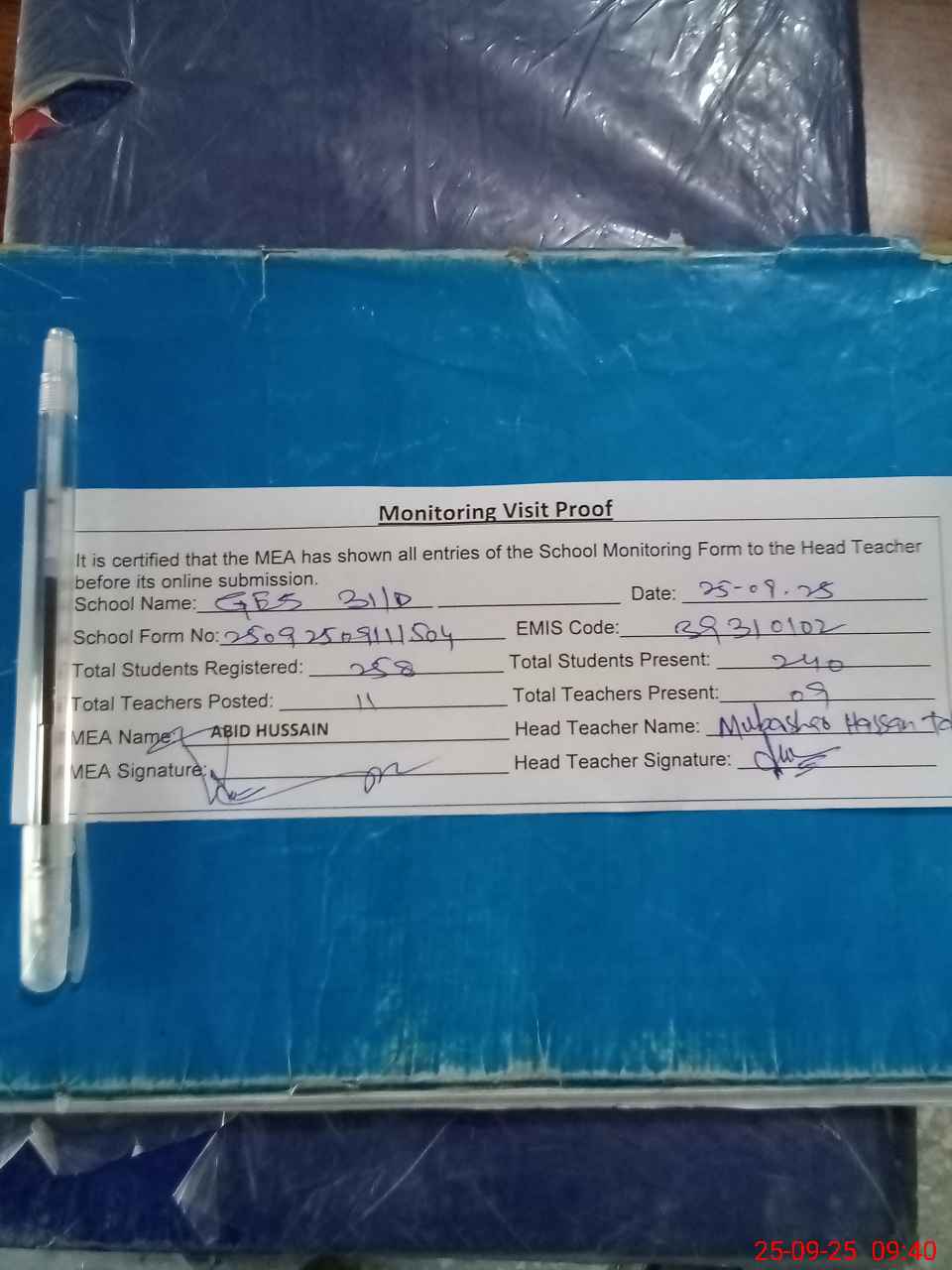 | Attendance Register | Head Teacher | MEA with School | Visit Proof |