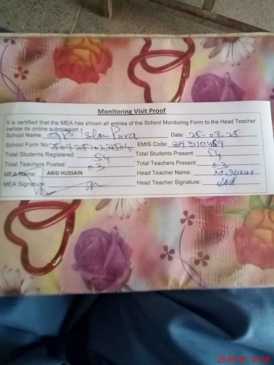 | Attendance Register | Head Teacher | MEA with School | Visit Proof |