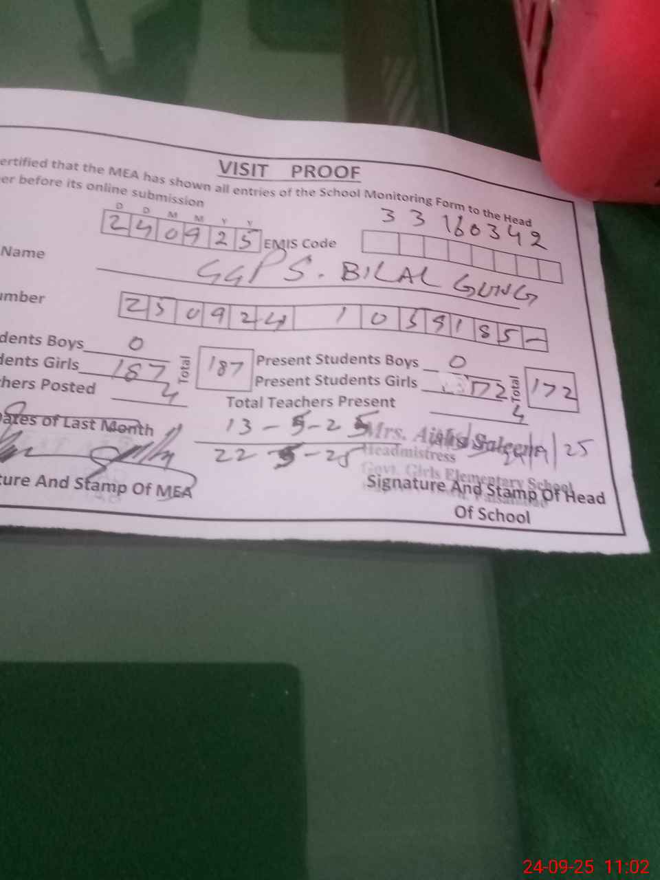 | Attendance Register | Head Teacher | MEA with School | Visit Proof |