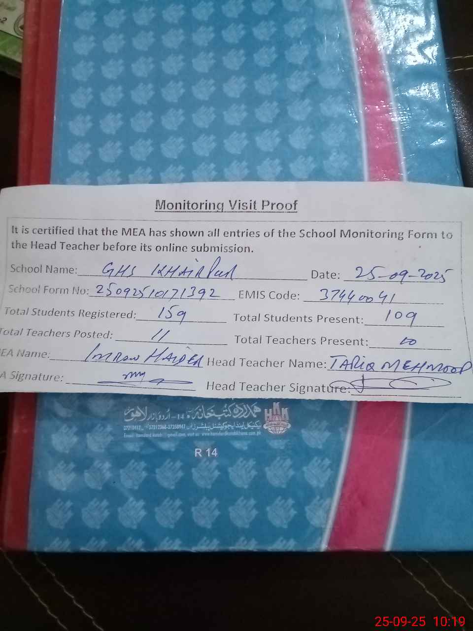| Attendance Register | Head Teacher | MEA with School | Visit Proof |