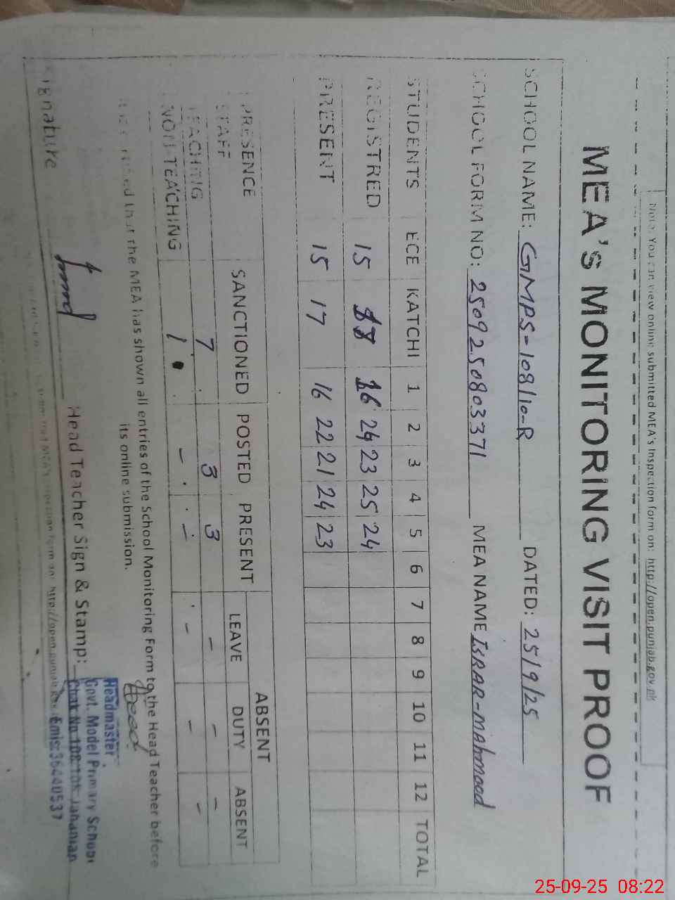 | Attendance Register | Head Teacher | MEA with School | Visit Proof |