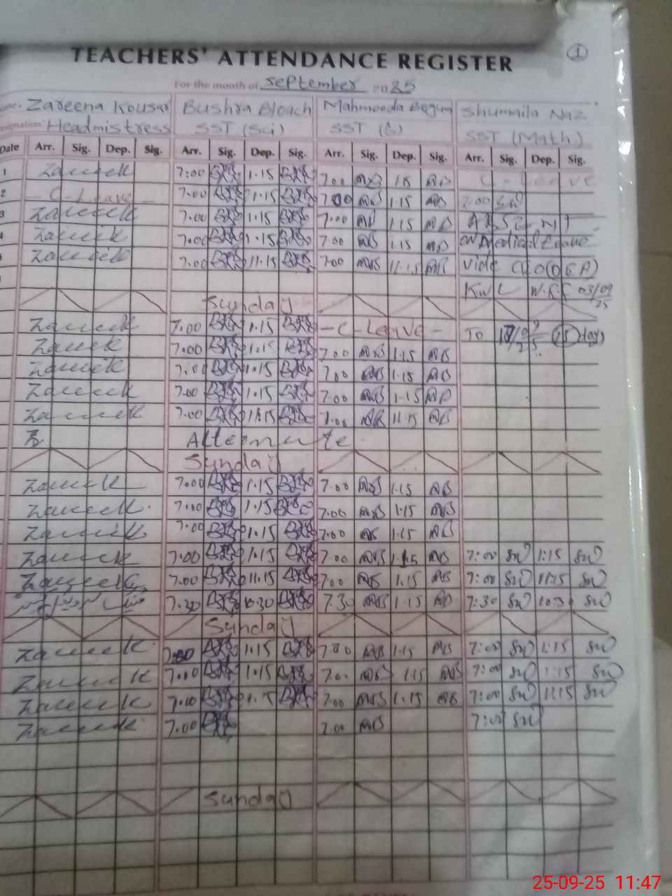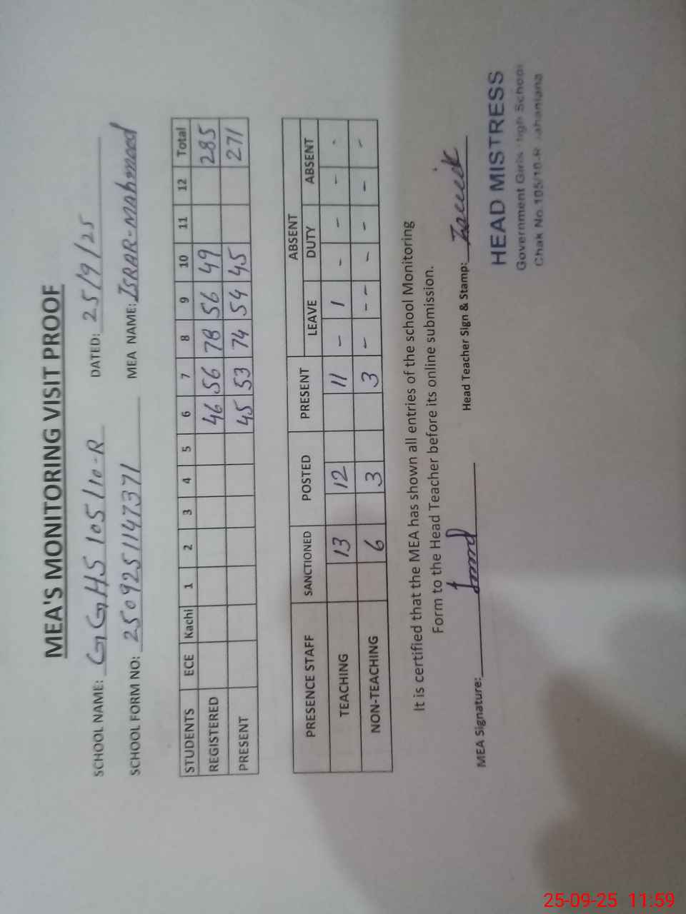 | Attendance Register | Head Teacher | MEA with School | Visit Proof |