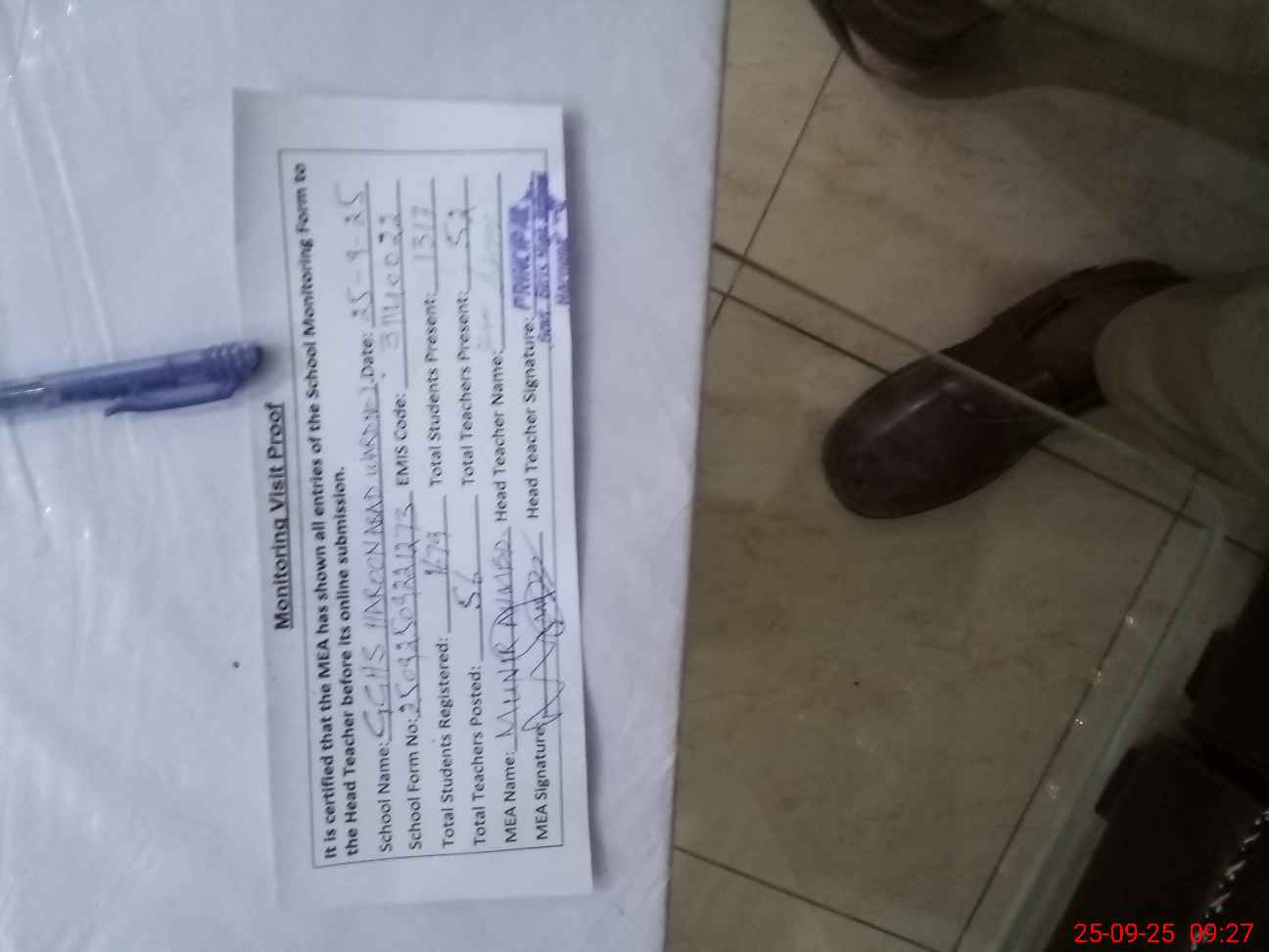 | Attendance Register | Head Teacher | MEA with School | Visit Proof |