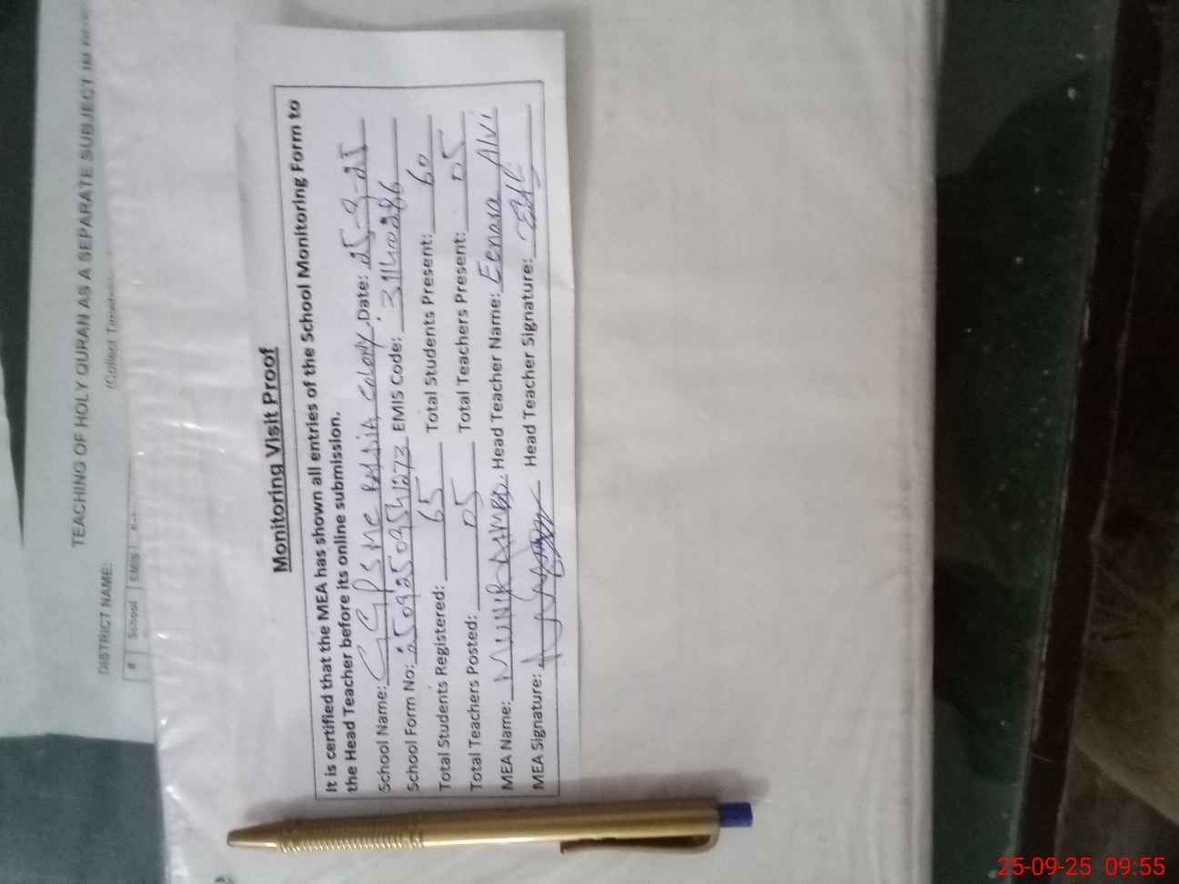 | Attendance Register | Head Teacher | MEA with School | Visit Proof |