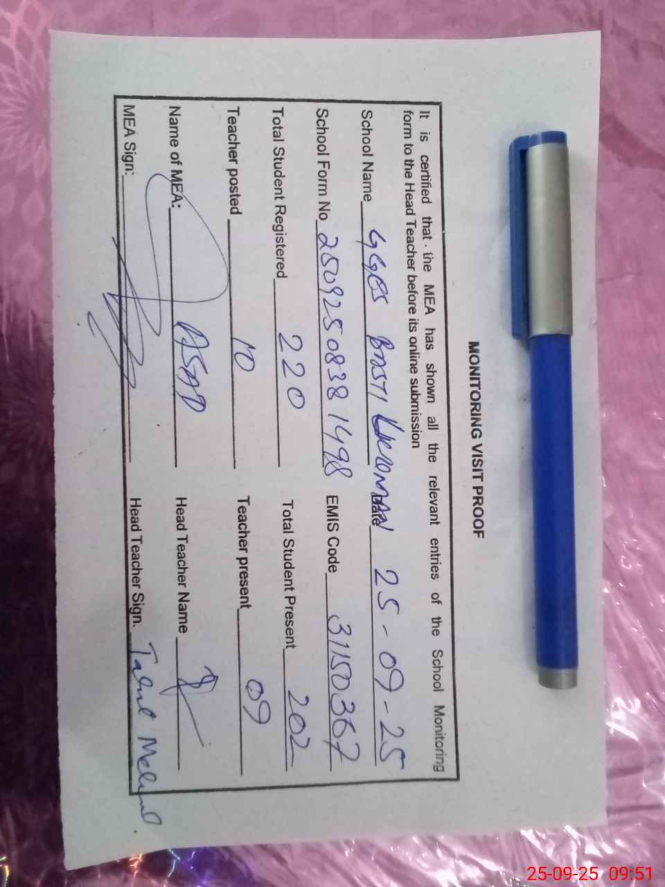 | Attendance Register | Head Teacher | MEA with School | Visit Proof |