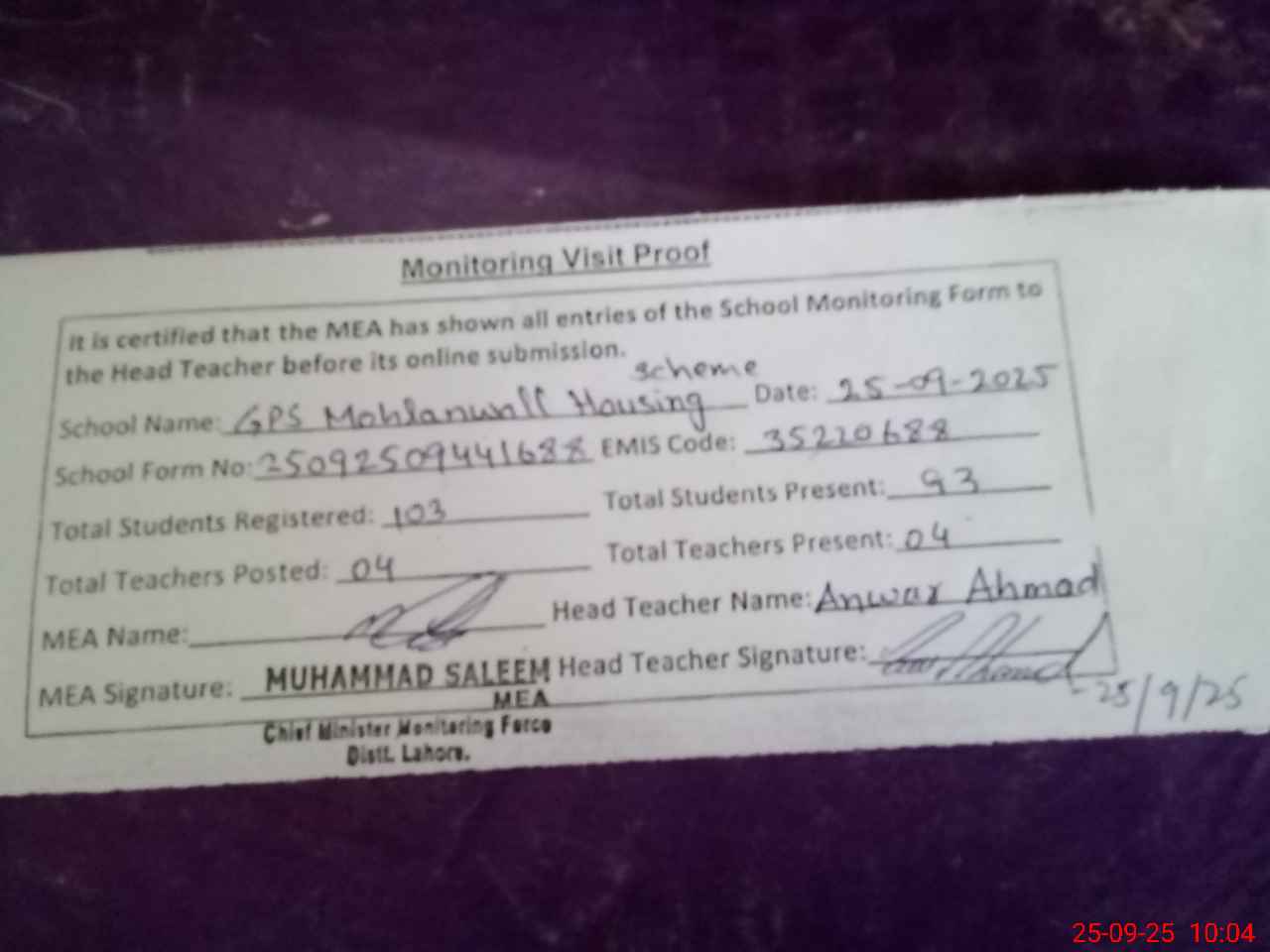 | EMIS Code: 35220688 | Name of School: GPS MOHLANWALHOUSING SCHEME | |||