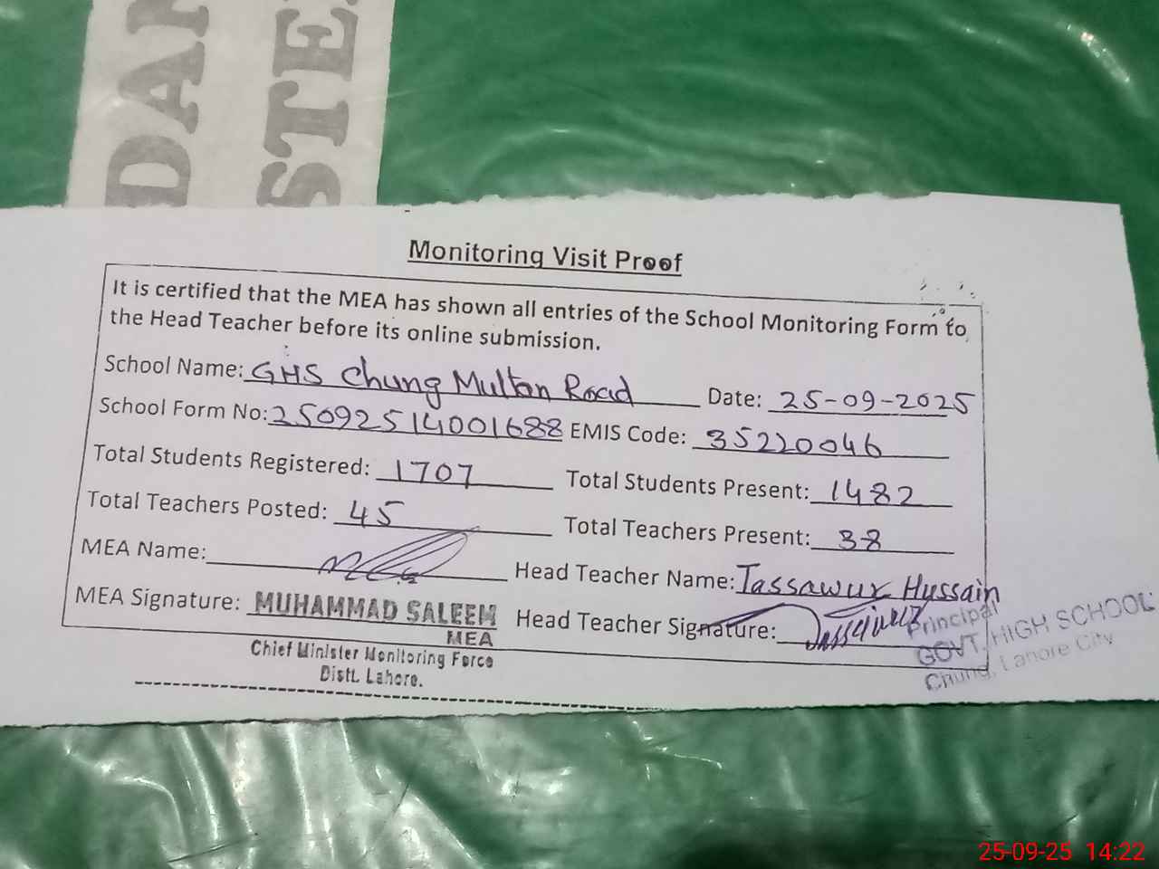 | Remarks (Use Separate Page if Required): PST Teacher Bashir Ahmad retired since October 2024 but his name in PMIU monthly monitoring application teaching staff list of said school is still exists SST teacher M Irfan Aslam removed from service since 26th April 2025 by order no 1924 A V Dated same date but his name in PMIU monthly monitoring application teaching staff list of said school is still exists SST teacher Naveed Ur Rehman is on temporary duty for books review in text books and criculium development by order of DEO Se PST teacher Asma Ameer have applied for earned leave her leave approval process is in progress so marked her absent as per SOP PST teacher Hafiz Asad Muneer found long absent since 8th September 2025 NQ Ghulam Rasool is on temporary duty with other for 120 days Mirza Antique Baig is on temporary duty with other for 89 days ECE kit partially available There are five classrooms used for teaching and four other rooms looking roofs partially dangerous required repairs work higher section class rooms windows required maintenance work Furniture required for about twenty teachers and hundred students as mentioned by head teacher There are 172 students required to delete from SIS 35220046 | |||||