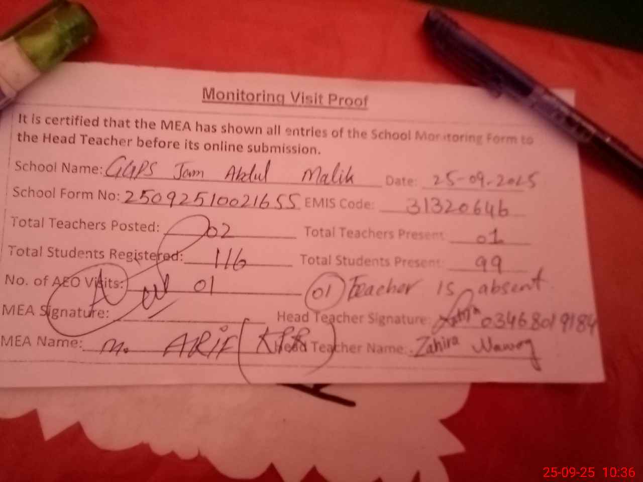 | Attendance Register | Head Teacher | MEA with School | Visit Proof |