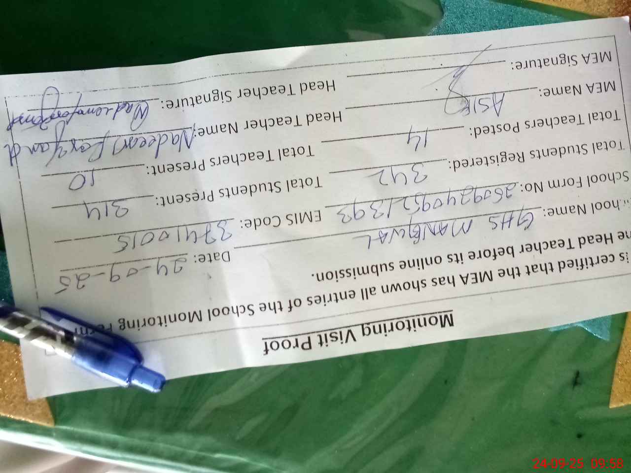 | Attendance Register | Head Teacher | MEA with School | Visit Proof |