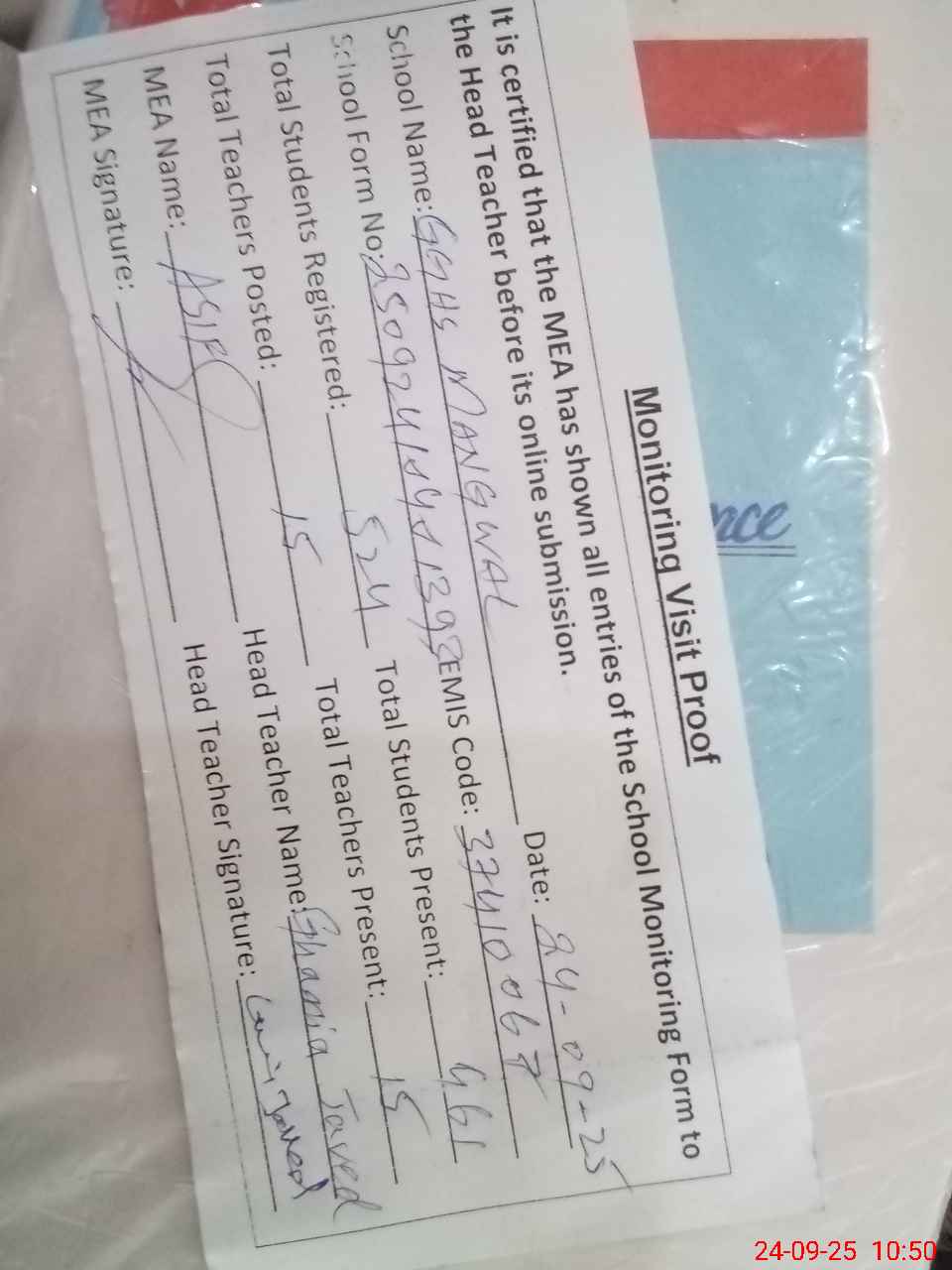| Attendance Register | Head Teacher | MEA with School | Visit Proof |