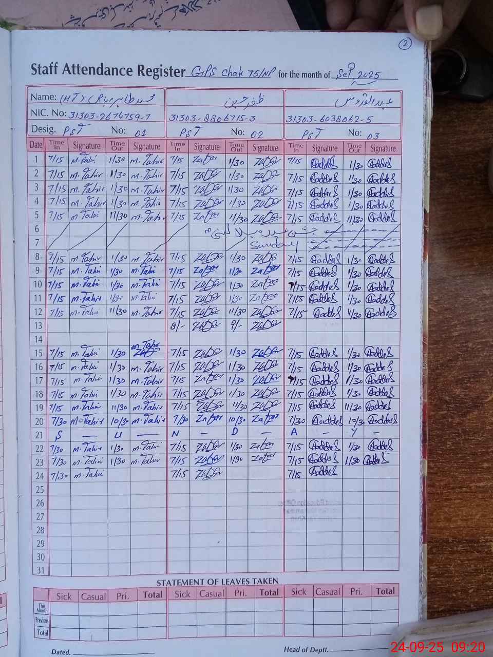 | CNIC | Full Name | Designation | R/C | Absence during last cal. month |