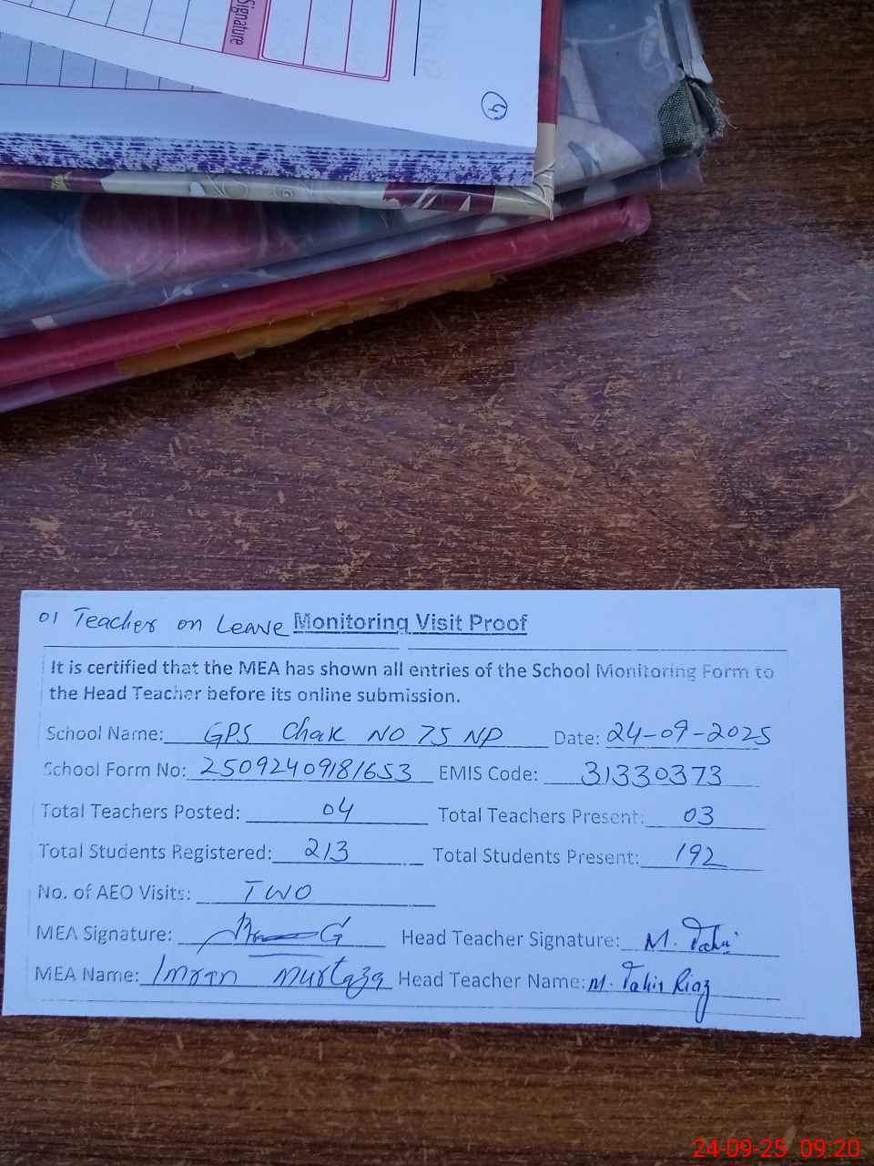 | Attendance Register | Head Teacher | MEA with School | Visit Proof |