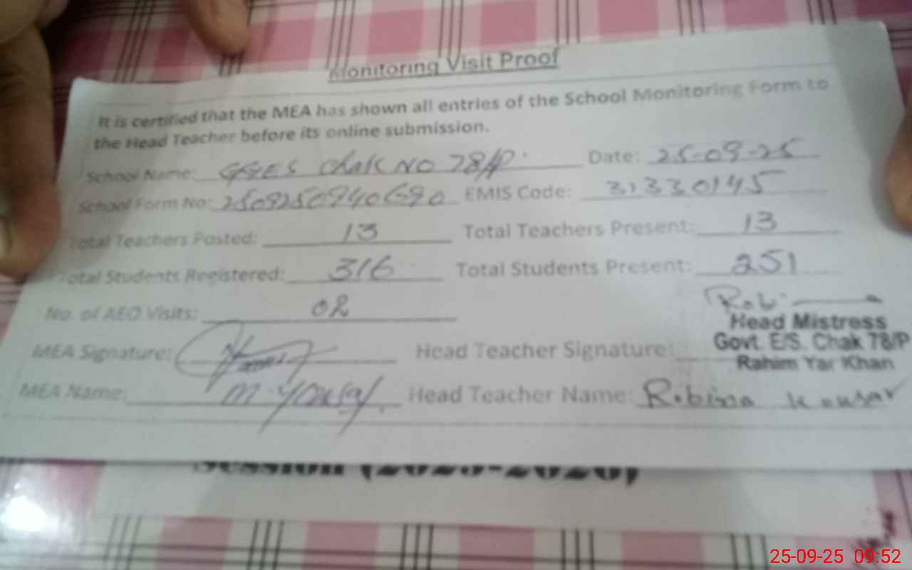 | Attendance Register | Head Teacher | MEA with School | Visit Proof |