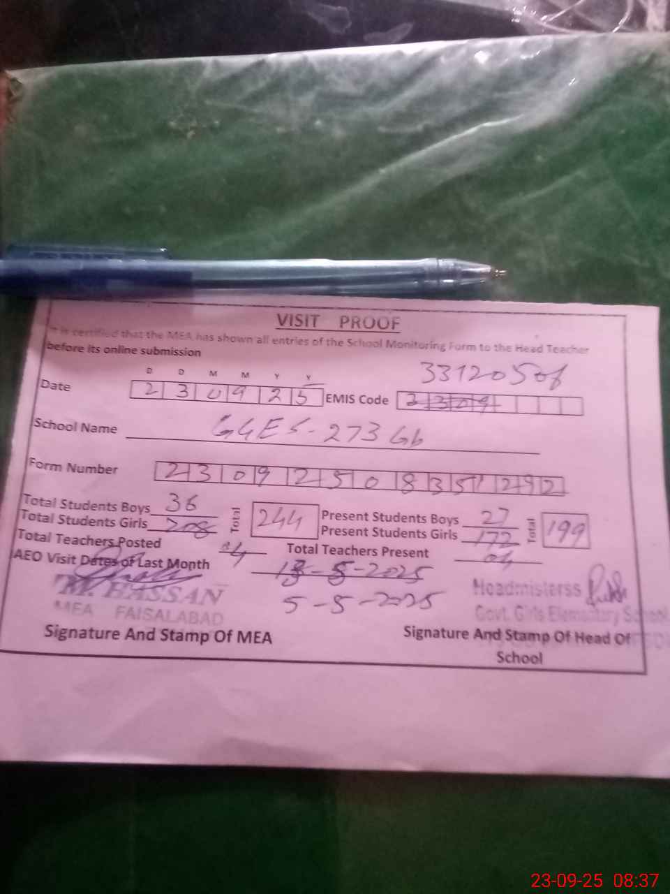 | Attendance Register | Head Teacher | MEA with School | Visit Proof |