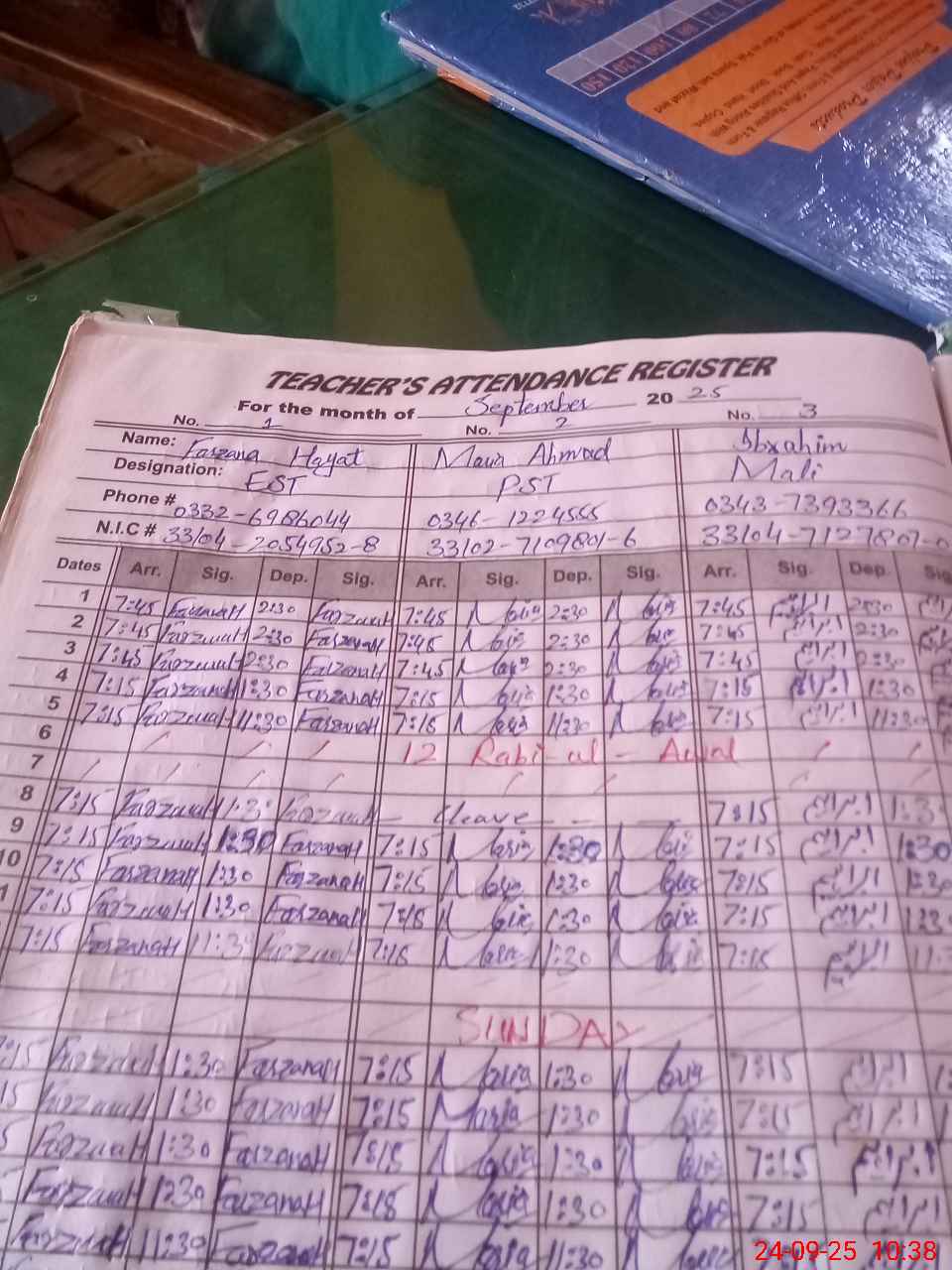 | CNIC | Full Name | Designation | R/C | Absence During Last Calender Month |