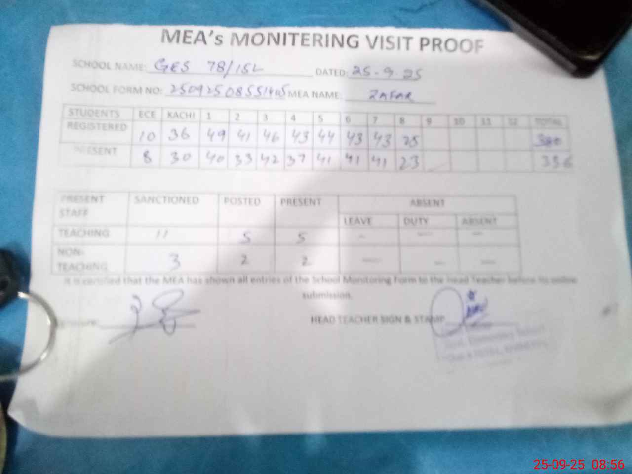 | Attendance Register | Head Teacher | MEA with School | Visit Proof |