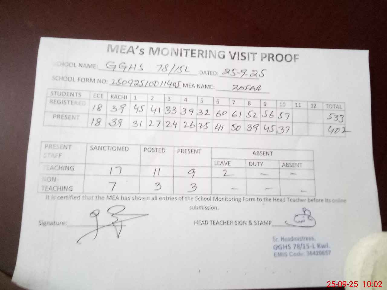 | Attendance Register | Head Teacher | MEA with School | Visit Proof |