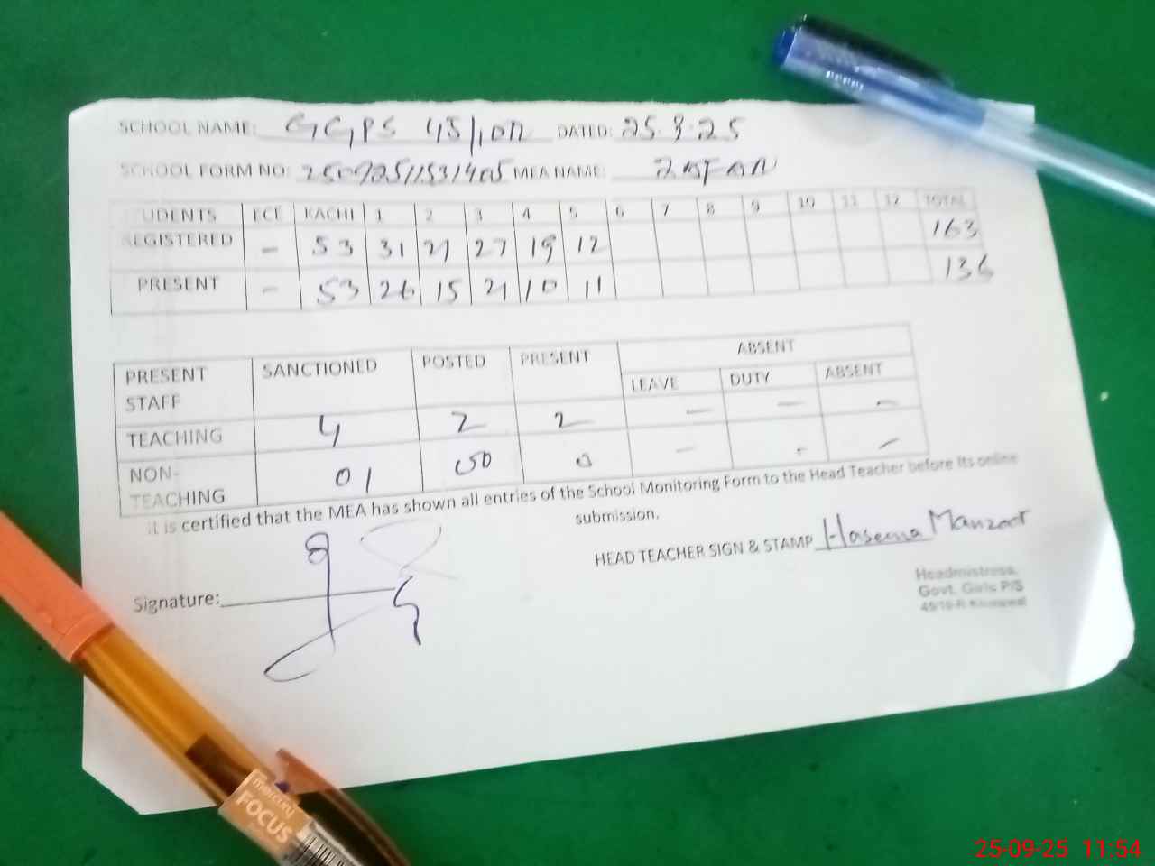| Attendance Register | Head Teacher | MEA with School | Visit Proof |