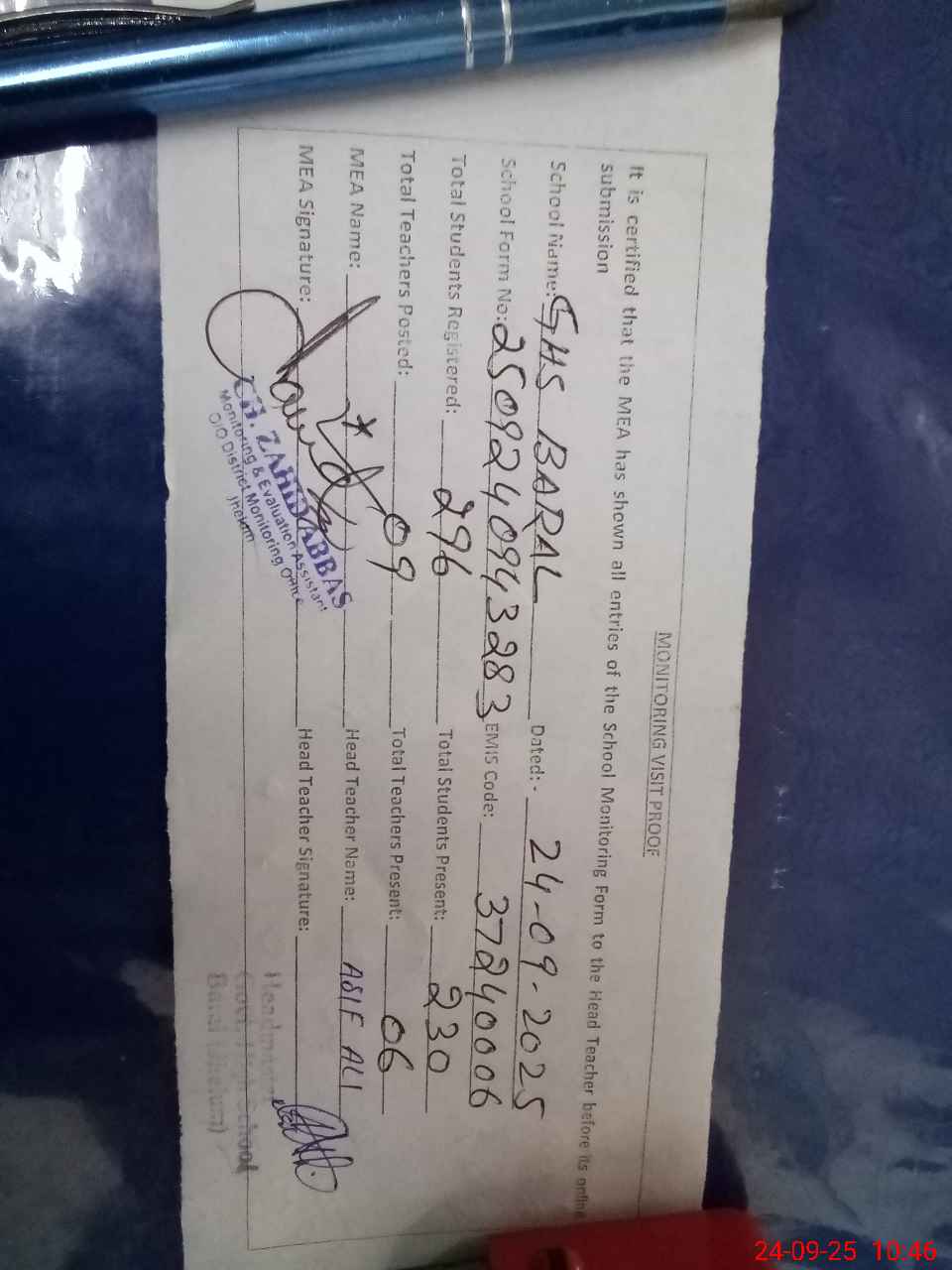 | Monitoring Date: 24-09-2025 | Start Time: 24-09-2025 09:43 AM | End Time: 24-09-2025 10:49 AM | Name of MEA: Za**** Ab**** | |