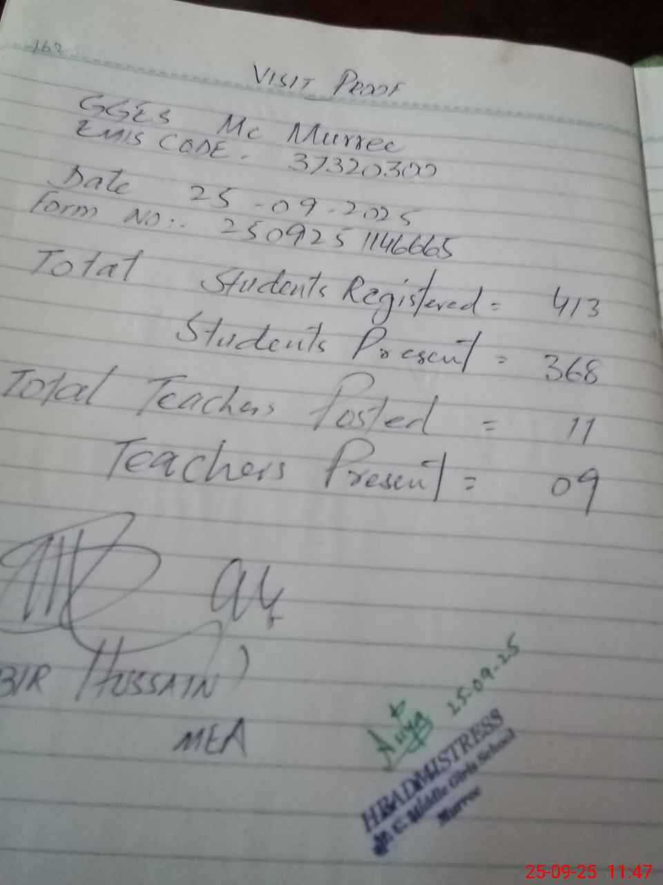 | Attendance Register | Head Teacher | MEA with School | Visit Proof |